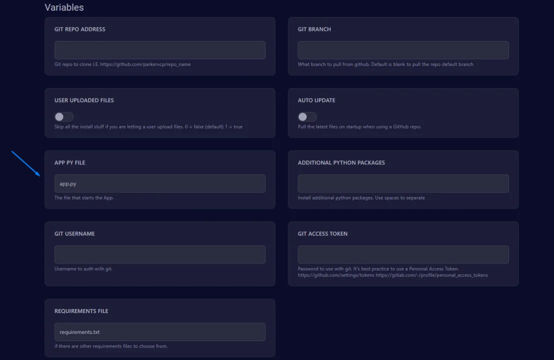 - APP PY FILE: This is the most important field. Type the name of the file that starts your bot (e.g., bot.py or main.py).